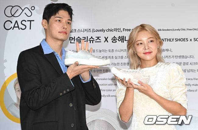 모델 정혁, 송해나가 자신과 콜라보한 먼슬리슈즈 실크 스니커즈 전시에 참석해 포즈를 취하고 있다. 2022.10.23 /cej@osen.co.kr