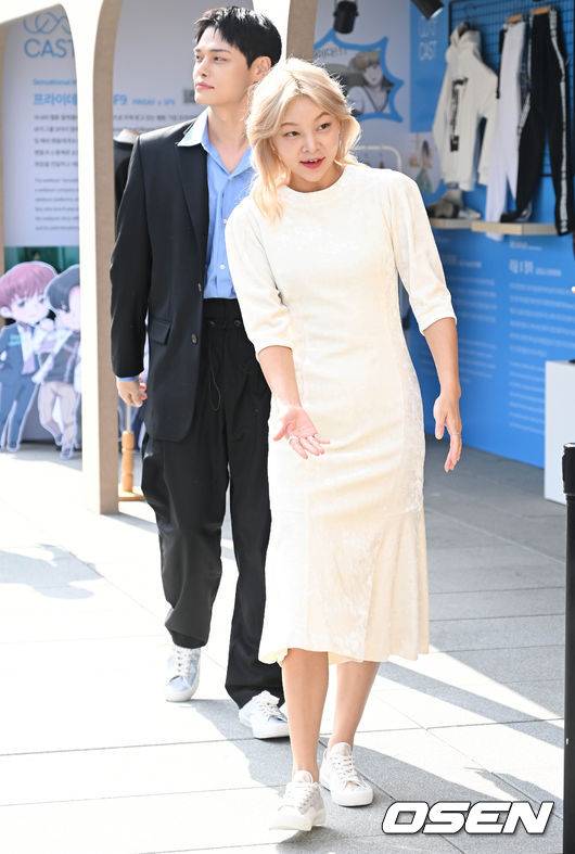 모델 정혁, 송해나가 자신과 콜라보한 먼슬리슈즈 실크 스니커즈 전시에 참석하고 있다. 2022.10.23 /cej@osen.co.kr