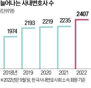 A변호사의 이직은 이례적 사례가 아니다. 최근 스카우트 제의를 받고 기업으로 떠나는 로펌 변호사가 눈에 띄게 늘고 있다. 23일 한국사내변호사회에 따르면 지난달 말 기준 이 단체의 회원 변호사는 총 2407명으로 작년 말(2235명)보다 7.7% 증가했다. 통계를 집계하기 시작한 2015년(1547명) 이후 매년 늘고 있다. 한국사내변호사회는 국내 사내변호사(약 4500명·업계 추산)의 절반 이상을 회원으로 두고 있다.