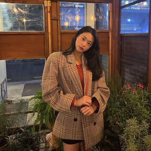설현은 짧은 치마에 주황색 카디건과 봉긋한 어깨 라인의 체크 재킷을 코디해 스타일리시한 가을 여신의 매력을 뽐냈다.