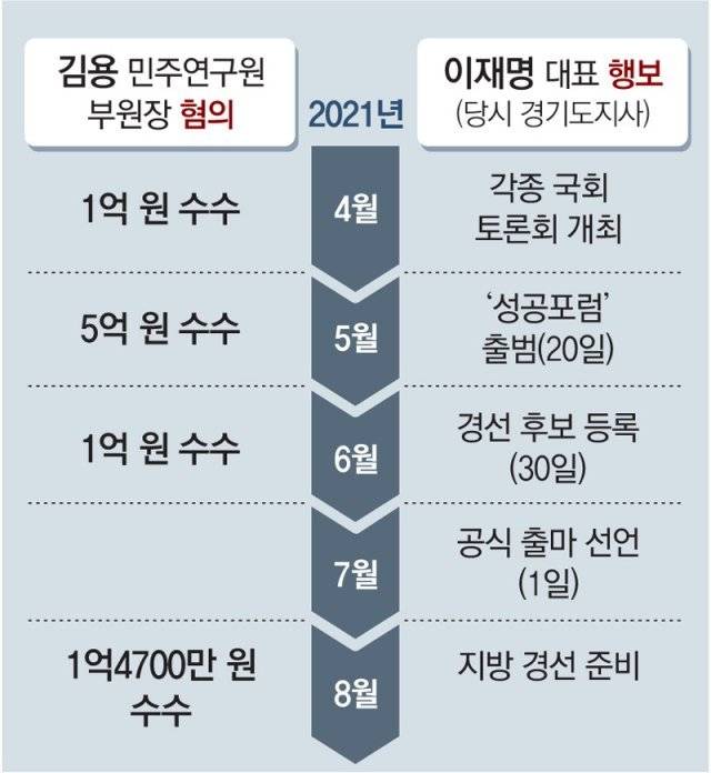 김 부원장은 지난해 4월 1억 원을 시작으로 5월 5억 원, 6월 1억 원, 8월 1억4700만 원 등 네 차례에 걸쳐 불법 정치자금을 받은 혐의를 받고 있다. 총 7억 원이 전달된 것으로 알려진 지난해 4∼6월은 이 대표가 경기도지사로 일하며 본격적으로 민주당 대선 후보 경선을 준비하던 시점이다. 지난해 4·7재·보궐선거에서 민주당이 참패하면서 공개 행보를 자제했던 이 대표는 지난해 4월 20일 서울 여의도에서 ‘청소·경비노동자 휴게시설 개선 국민 토론회’를 열며 본격적인 대선 주자 행보에 나섰다.