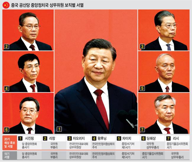 이날 공개된 중국 공산당 최고지도부의 서열은 시 주석을 시작으로 리창(李强) 상하이(上海)시 당서기, 자오러지(趙樂際) 중앙기율검사위원회 서기, 왕후닝(王호寧) 중앙서기처 제1서기, 차이치(蔡奇) 베이징(北京)시 당서기, 딩쉐샹(丁薛祥) 중앙판공청 주임, 리시(李希) 광둥(廣東)성 당서기 순이다. 상무위원 전원이 ‘시자쥔’(習家軍)으로 불리는 측근들로 채워진 가운데, 이전까지 서열 6위였던 기율위 서기를 맡을 리시 당서기가 서열 7위로 한 계단 하락한 게 눈에 띈다. 또 가장 어린 상무위원이 60세인 딩 주임일 정도로 상무위원들의 나이가 많은데, 우위산(吳玉山) 대만 중앙연구원 연구원은 “시 주석이 본인의 후계자를 지명할 의사가 없다는 것을 의미한다”고 밝혔다.