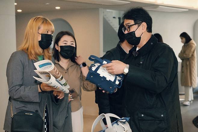 | ▲ 강동솔루션앵커 서울가죽패션스마트센터 홍찬욱 센터장이 '팝업스토어'에 방문한 이들에게 제품을 설명하고 있다. |