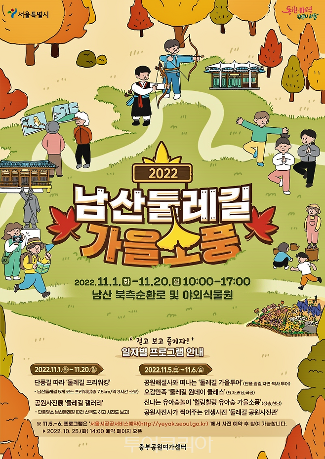 깊어가는 가을, 남산의 아름다운 단풍을 배경으로 진행되는 '2022년 남산둘레길 가을소풍'전체 프로그램별 자세한 사항은 '서울의공원' 누리집에서 확인할 수 있다.