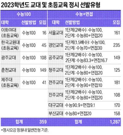 2023학년도 교대 및 초등교육과 정시 선발은 ‘수능 100’ ‘수능+면접’ 방식의 크게 두 가지 유형으로 나뉜다. 수능 100%로 선발하는 대학은 이화여대(초등교육과) 한국교원대(초등교육과) 제주대(초등교육과) 광주교대 춘천교대 등이다. 나머지 교대는 모두 최종 선발 단계에서 면접 성적을 최소 9.1%에서 최대 30%까지 반영한다. 예컨대 서울교대는 ‘1단계(2배수): 수능 100, 2단계: 수능 80+면접 20’ 같은 방식으로 선발한다.