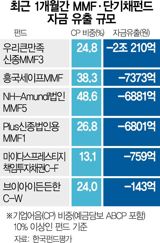 24일 한국펀드평가에 따르면 최근 CP 비중(예금담보 ABCP 포함)이 10% 이상인 MMF에서 자금 유출이 잇따르고 있다. 보유 CP 비중이 24.8%가량인 ‘우리큰만족신종MMF3’에서는 최근 1개월간(9월 21일~10월 21일) 2조 210억 원의 투자 자금이 빠져나갔다. 같은 기간 ‘흥국세이프MMF(CP 비중 38.3%)’에서는 7373억 원, ‘NH-Amundi법인MMF5(48.6%)’는 6881억 원, ‘Plus신종법인용MMF1(26.8%)’은 6801억 원 규모가 유출됐다. 흥국세이프MMF는 일반 CP가 아닌 예금담보 ABCP 등을 담고 있음에도 환매 규모가 컸다.