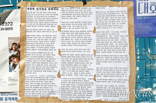윤석열 대통령의 모교 서울대에 윤 대통령의 퇴진을 요구하는 실명 대자보가 붙었다. 앞서 두 차례 윤 대통령 탄핵을 요구하는 대자보에 이어 세 번째로 서울대에 걸린 윤 대통령 비판 대자보다. 첫 실명 대자보이기도 하다.
