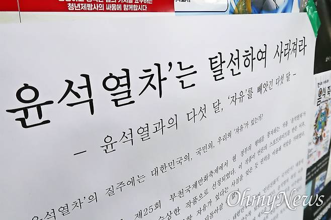 이들은 '윤석열차는 탈선하여 사라져라'라는 제목의 대자보를 통해 "자유를 탄압하고 평등을 조롱하며 정의를 무너뜨리는 시대로 되돌아갈 수 없다"며 "우리는 자유를 탄압하는 윤석열의 반자유적 횡포를 강력히 규탄한다"고 밝혔다.