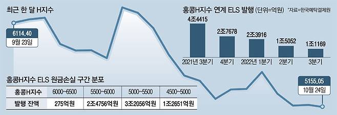 H지수는 연초 대비 36% 넘게 급락해 코스피(-25%)와 상하이종합주가지수(-17%) 등에 비해 부진한 흐름을 보이고 있다. 미국발 금리 인상과 긴축 가속화로 홍콩 증시에 상장된 기술주들이 타격을 입었고, 중국 정부의 반독점 규제 등 정책 우려까지 겹치며 투자심리가 악화된 것으로 분석된다. 또 시진핑 중국 국가주석의 3연임이 결정된 후로 홍콩 증시가 급락하고 있는 상황을 고려하면 향후 추가적인 하락 가능성도 있다. 이 경우 ELS 관련 투자자들 손실은 더 커질 수밖에 없는 상황이다. 홍콩 증시 하락세가 내년 초 이후 진정될 것이라는 전망도 나온다. 김경환 하나증권 연구원은 "홍콩 증시가 코로나19 팬데믹 이후 전 세계와 중국 증시 대비 유독 부진한 이유는 긴축으로 인한 경기 침체에 더해 극단적인 산업 정책, 부동산, 미·중 관계 등 구조적 위험이 중첩됐기 때문"이라며 "다만 상반기 홍콩 증시가 이미 주가순자산비율(PBR) 1배를 하회하며 이 같은 우려를 상당 부분 반영하고 있어 내년 상반기에 회복할 가능성이 있다"고 말했다.