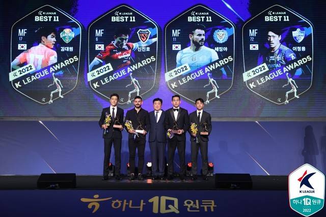 24일 오후 2시부터 서울시 서초구 양재동에 위치한 더케이호텔 서울 컨벤션센터 그랜드볼룸에서 벌어진 하나원큐 K리그 어워즈 2022가 벌어졌다. 2022시즌 K리그1·2를 아울러 최고의 선수와 지도자를 추리는 이날 시상식에서 하나원큐 K리그1 2022에서 맹활약을 펼친 열한 명의 선수가 발표했다.