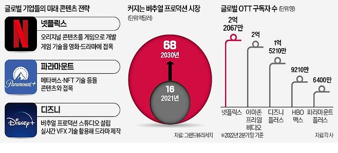 파라마운트 등 글로벌 콘텐츠 기업도 여기에 대비하고 있다. 박이범 파라마운트 아시아 사업·스트리밍 대표는 한국경제신문과의 인터뷰에서 “파라마운트는 미래 콘텐츠를 준비하는 ‘퓨처리스트’ 팀을 꾸리고 메타버스, 대체불가토큰(NFT) 등 신기술과 접목하는 방법을 연구하고 있다”고 했다. 그는 “메타버스를 이용하면 시청자가 게임처럼 1인칭 시점에서 콘텐츠와 소통하며 작품을 즐길 수 있을 것”이라며 “이르면 2025년부터 메타버스 콘텐츠를 선보일 계획”이라고 덧붙였다.