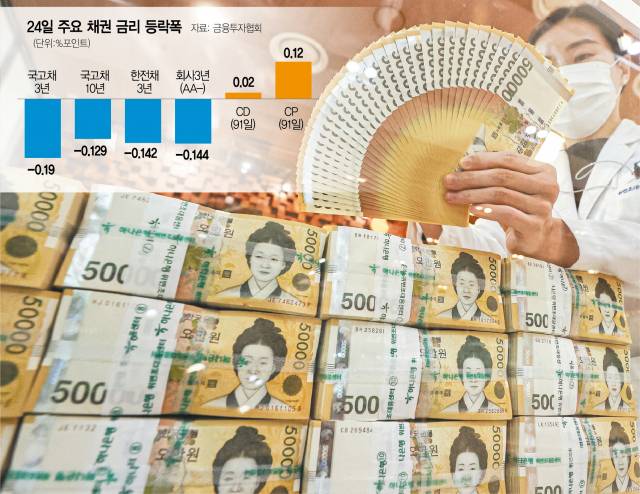 회사채 뿐 아니라 단기물 시장의 분위기 역시 달라지지 않았다. 국고채와 통화안정증권(통안채) 중심으로 정부의 정책 효과에 대한 기대감을 흡수하며 진정세를 보였지만 기업어음(CP) 등 단기자금 시장은 여전히 살얼음판을 걸었다. 이날 국고채 3년물 금리는 전 거래일보다 19bp내린 연 4.305%에 거래를 마쳤다. 금리는 이달 12일(종가 연 4.107%)부터 연일 치솟다 이날 8거래일 만에 하락 전환했다. 10년물 금리 역시 전일 대비 12.9bp 빠진 연 4.503%를 기록했다. 이달 나날이 연중 최고치를 경신하던 20~50년 만기 장기물 금리 역시 일제히 하락하며 소강상태에 접어들었다. 회사채 매도 호가 역시 완화되는 분위기였다. 만기가 5개월여 남은 해태제과식품의 5년 만기 회사채는 4.864%에서 24일 24bp 가산금리가 붙은 5.1%에 거래됐다. 일주일 전 만기가 3개월 남은 LG유플러스 회사채가 122bp, 1년 5개월 남은 SK에너지 회사채가 51bp 등이었던 것과 비교하면 크게 낮아진 수준이다.