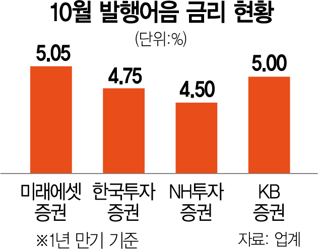 24일 금융투자 업계에 따르면 한국투자증권은 5.2%의 6개월물 자체 발행어음 특판을 출시하며 고객 유치에 나섰다. 한투증권은 3개월짜리 발행어음도 4.7%를 제시하고 있다. 미래에셋증권과 KB증권은 연 5%가 넘는 금리의 발행어음을 판매하고 있다. 미래에셋증권이 연 5.05%의 1년 만기 정액 적립식 발행어음을 판매하며 가장 높은 이자를 책정했고, KB증권도 5% 상품을 내놓은 상황이다.