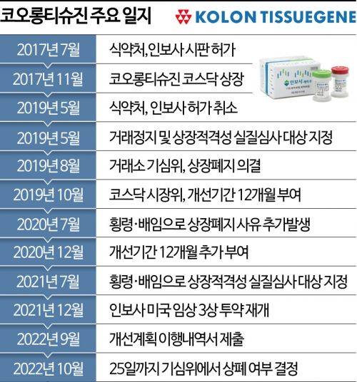 이에 따라 거래소도 코오롱티슈진의 주식 거래를 정지하고 상장 적격성 실질 심사 대상으로 지정했다.