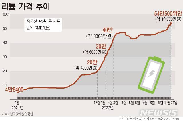 리튬 가격은 지난해 말부터 본격 상승했다. 2021년 1월초 4만8400위안에 불과했지만 같은 해 12월 20만위안(약 4000만원)을 돌파했고, 올해 1월 30만위안(6000만원)대, 2월 40만위안(8000만원)을 넘었다.