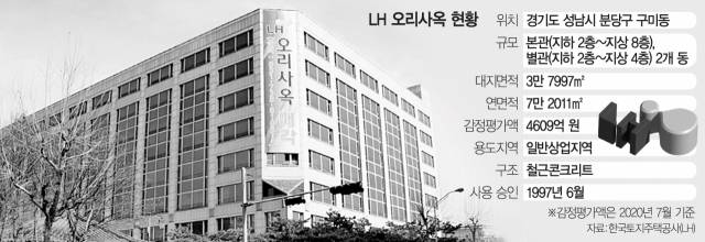 오리사옥은 LH 통합 출범 전 대한주택공사가 본사 사옥으로 사용하던 건물이다. LH는 토지공사와 주택공사가 통합한 2009년 10월 이후 10여 년간 총 14차례의 매각 공고를 냈지만 입찰자가 없어 매번 실패했다. 현재는 LH 경기지역본부로 사용되고 있다. 1997년 준공된 오리사옥은 대지 면적 3만 7997㎡, 건축 연면적 7만 2011㎡에 본관(지하 2층~지상 8층)과 별관(지하 2층~지상 4층)으로 구성돼 있다.