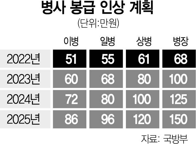 국방부는 2023년부터 병사 봉급 인상을 시작해 2025년까지 봉급 150만 원과 자산 형성 프로그램인 내일준비지원 사업의 지원금 약 55만 원을 합해 병장 기준 월 205만 원의 소득을 지원할 계획이다. 이에 따라 병사 인건비는 2022년 2조 3324억 원에서 2025년 4조 1368억 원으로 56.3% 인상되고 내일준비지원 사업도 2022년 2190억 원에서 2025년 1조 6215억 원으로 640% 이상 늘어난다.