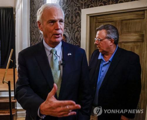 epa10265699 Wisconsin US Senator Ron Johnson (L) campaigns at a rally at Tuskin Hall in Waukesha, Wisconsin, USA, 25 October 2022. Johnson is running against Wisconsin Lieutenant Governor Mandela Barnes in the 2022 Mid-term election. EPA/TANNEN MAURY