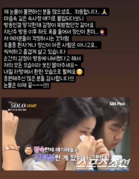 영숙은 최근 자신의 개인 계정에 "제 눈물이 불편하신 분들 많으셨죠 죄송합니다"라고 입을 열었다.