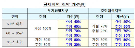 청년·미혼가구의 청약 당첨기회도 대폭 확대된다. 공공분양 선택형·나눔형에는 미혼 청년을 위한 특별공급이 신설된다. 민간청약의 추첨 물량도 늘어나 당첨 여지가 커진다. 현재 투기과열지구에서 60㎡ 이하 면적은 모든 물량(100%)이 가점으로 당첨자가 결정되는데, 개선안에 따라 가점제 물량은 40%로 줄고 추첨물량 60%가 새로 생겨난다.