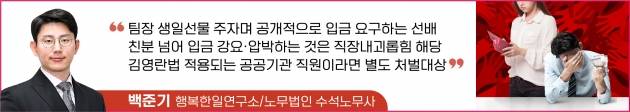 한편, 민간 기업 종사자가 아닌 공공기관 종사자의 경우 부정청탁 및 금품 등 수수의 금지에 관한 법률의 적용 대상인 '공직자등'은 경조사비나 선물 등에 대하여 그 가액이 정해져 있고, 내부 윤리강령이나 교육 등을 통해 일정하게 규율하고 있습니다. 만약 이와 같은 사례가 공공기관 등에서 발생하였다면 직장 내 괴롭힘 외에도 제재의 대상이 될 수 있을 것입니다.