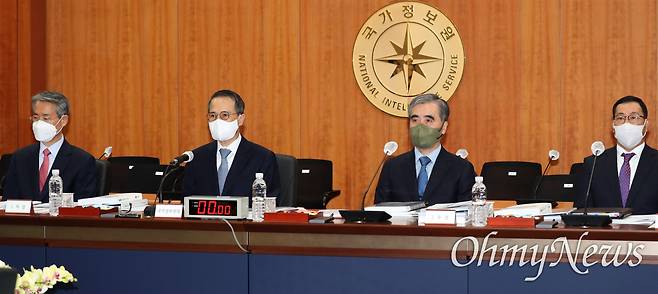 | ▲ 26일 서울 내곡동 국가정보원 청사에서 열린 국회 정보위원회의 국정원에 대한 국정감사에서 김규현 국정원장이 국정감사 시작을 기다리고 있다. 왼쪽부터 권춘택 1차장, 김 원장, 김수연 2차장, 백종욱 3차장. 조상준 기조실장은 국감 시작 전 일신상의 이유로 사의를 표명해 국정감사에 출석하지 않았다. |