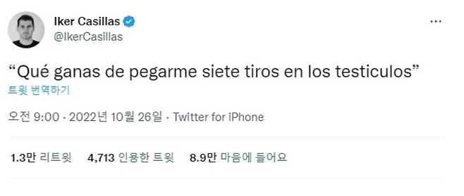 스페인 매체 '마르카'는 25일(현지시간) "카시야스는 이달 초 기괴한 트윗으로 헤드라인을 장식했다. 그런데 이번에는 고환 트윗으로 다시 돌아왔다"라고 전했다.