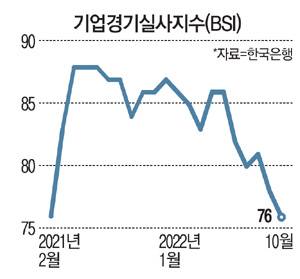 이날 한국은행이 발표한 '10월 기업경기실사지수(BSI)'에 따르면 이달 BSI는 지난해 2월 이후 20개월 만에 최저 수준을 기록했다.
