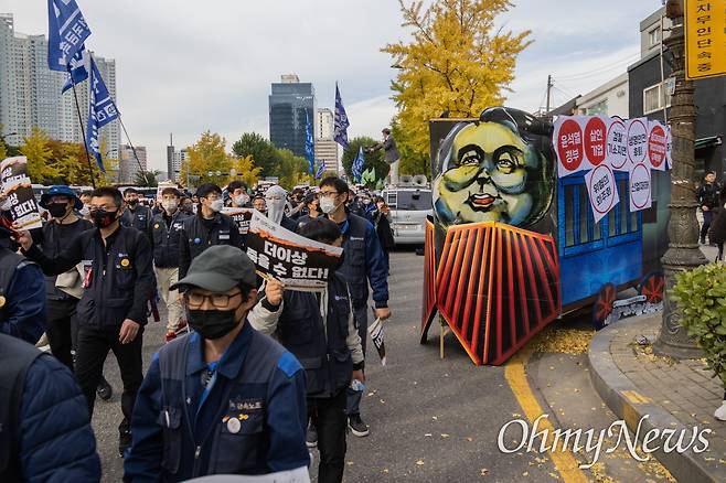 [오마이포토] "산재 그만"... 대통령실 행진길 등장한 '윤석열차'