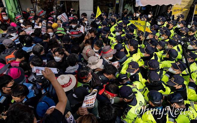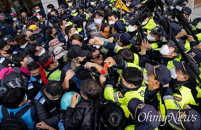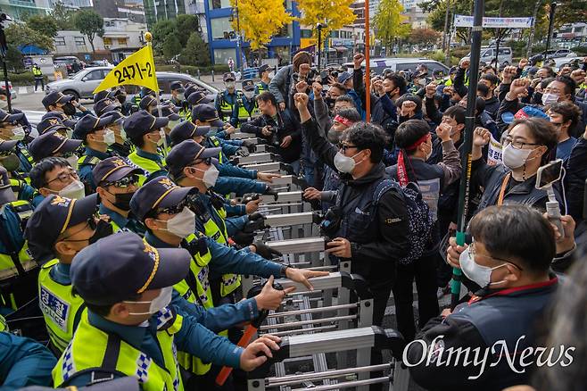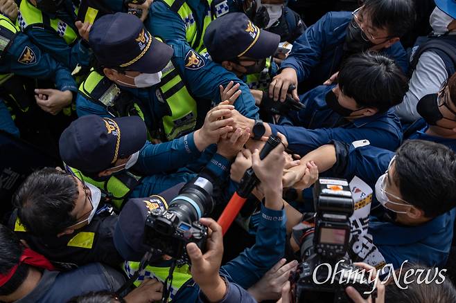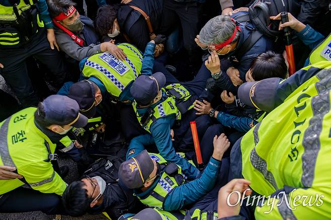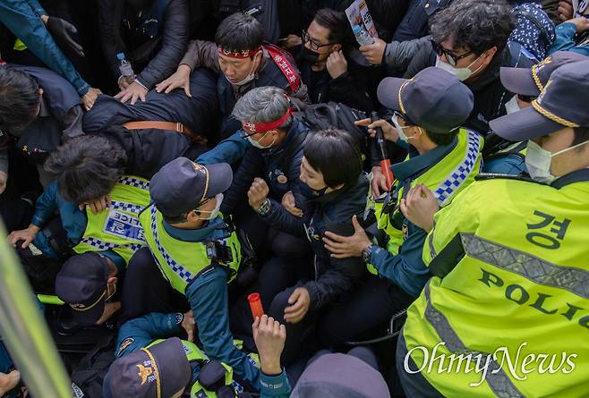 [오마이포토] 민주노총, 행진중 경찰과 충돌... '윤석열차' 등장