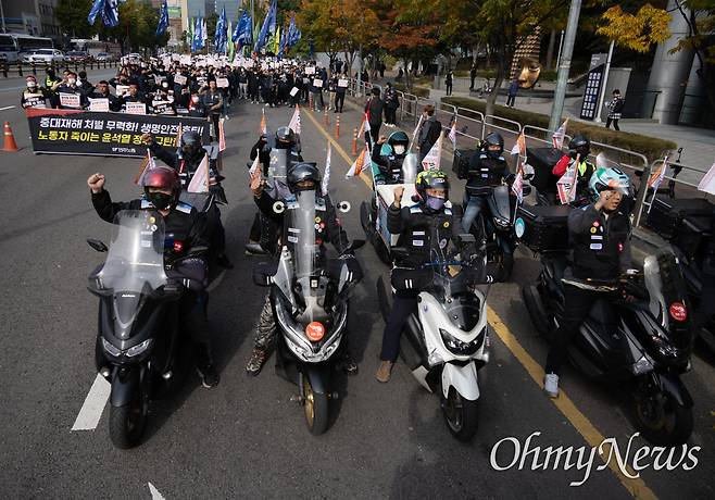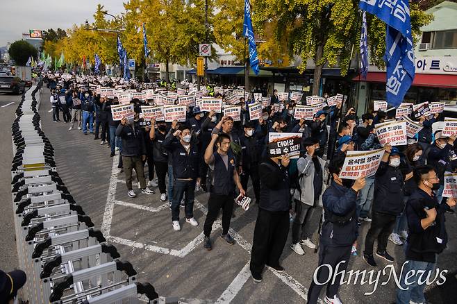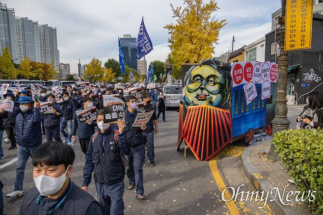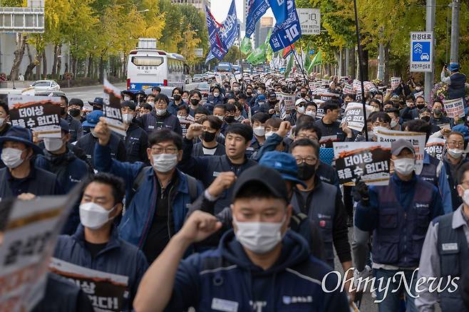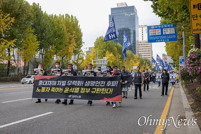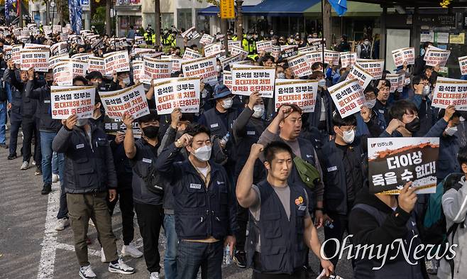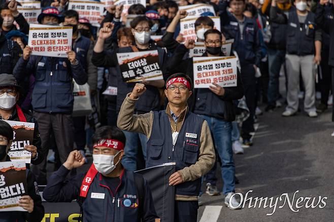 민주노총 조합원들은 이날 오후 서울 중구 서울역 인근에서 진행된 결의대회를 마친 뒤 서울역을 출발해 용산 대통령실로 향하는 행진을 시작했다.