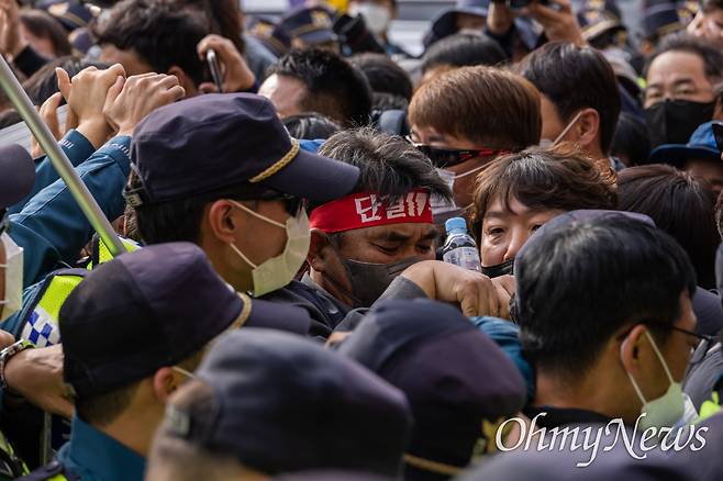 '중대재해 처벌 무력화하는 윤석열 정부 규탄 결의대회'를 마치고 용산 대통령실 쪽으로 행진에 나선 전국민주노동조합총연맹(아래 민주노총) 조합원들과 경찰이 충돌했다.