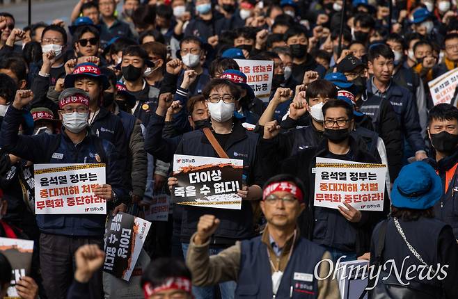 | ▲ 중대재해 처벌 무력화 하는 윤석열 정부 규탄 결의대회에 참석했던 민주노총 조합원들이 26일 오후 서울역 일대를 출발해 용산 대통령실 쪽으로 행진하고 있다. |