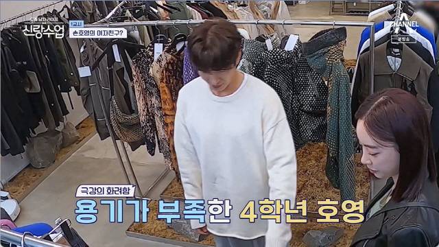 하지만 용기가 부족한 손호영은 평소와 다른 느낌의 옷들에 머뭇거렸다. 양정원이 직접 골라준 옷을 얌전히 갈아입은 손호영, 양정원은 긴 바짓단을 손수 접어주며 달달한 분위기를 풍겼다. 이에 MC들은 "여사친이 여자친구가 될 수도 있다. 가까운데서 찾아야 된다. 잘 어울린다"라며 입을 모았다.