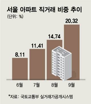 국토교통부 실거래가 공개시스템에 따르면, 지난 9월 한 달간 서울 아파트 전체 거래 305건 중 직거래는 62건(20.32%)으로 집계됐다. 아파트 매매 거래 5건 중 1건 꼴로 직거래가 이뤄진 셈이다. 아파트 매매거래가 급감한 가운데 직거래 비중은 높아지고 있다. 서울 아파트 직거래 비중은 올해 6월 8.11%(전체 1827건 중 370건) 7월 11.41%(666건 중 76건) 8월 14.74%(685건 중 101건) 9월엔 20.32%(305건 중 62건)로 3개월 연속 높아졌다.