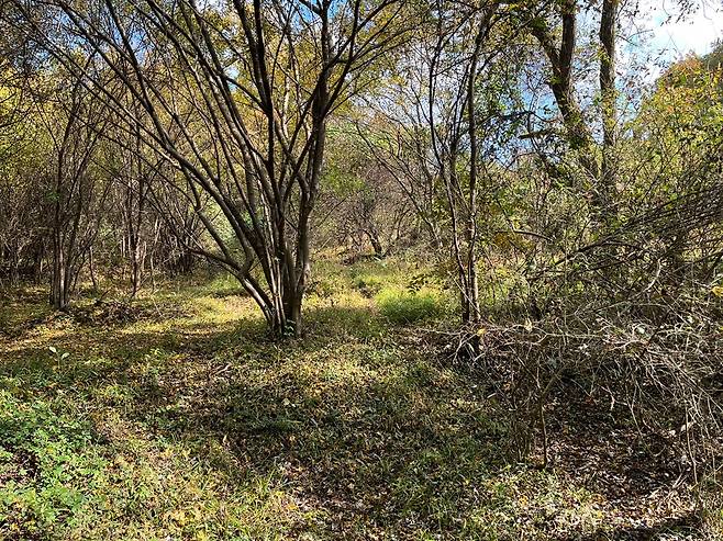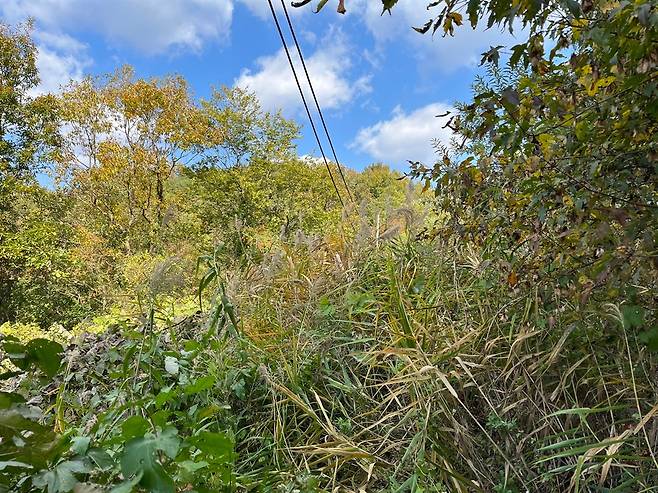 잊힌 고갯길에는 억새의 하얀 꽃, 솔바람 소리와 늦가을의 서늘한 공기가 고개의 옛날 이야기를 지키고 있다. 청량한 가을 햇살이 풍요롭다. 잊힌 고개가 쓸쓸할 거라는 감상은 편견에 지나지 않았다. 고갯길의 흔적을 지워가고 자연으로 회복되어 풍요롭고 평온한 숲이 되고 있다. 전봇대와 전선이 관목과 풀숲을 헤치고 조용히 고개를 넘어가고 있다.