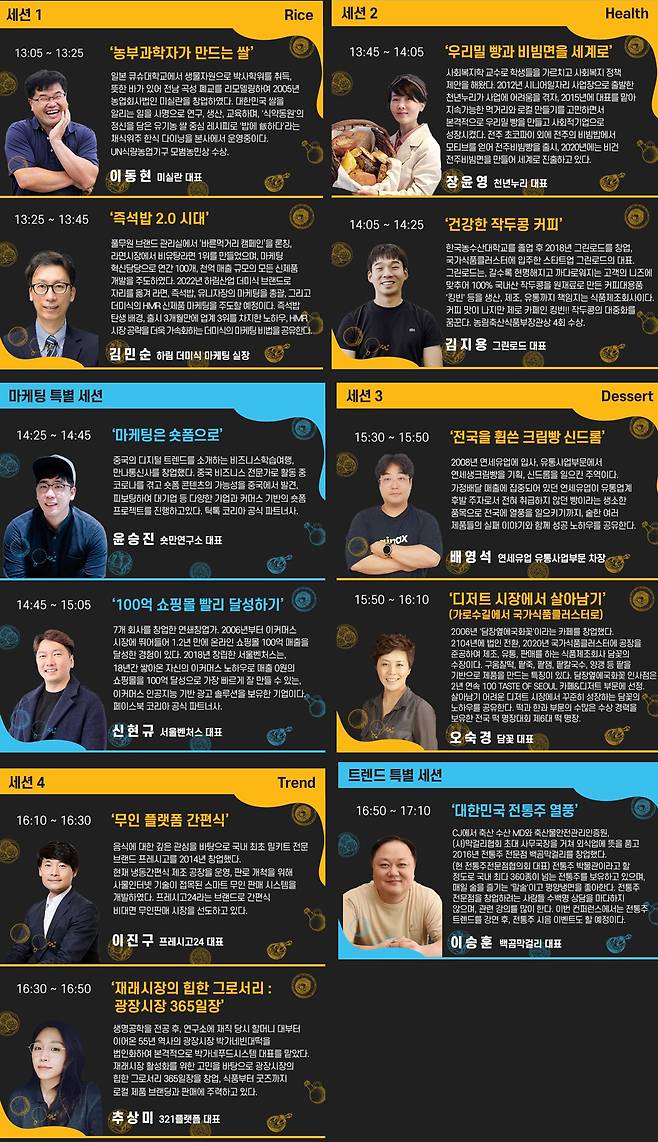 디저트 세션에서는 크림빵 신드롬을 일으킨 연세크림빵의 기획자 연세유업 배영석 차장이 실패와 성공 스토리를 공개한다. ‘담꽃’의 오숙경 대표는 작은 카페로 시작하여 국가식품클러스터에 입주하기까지의 과정과 성장 노하우를 공유한다.