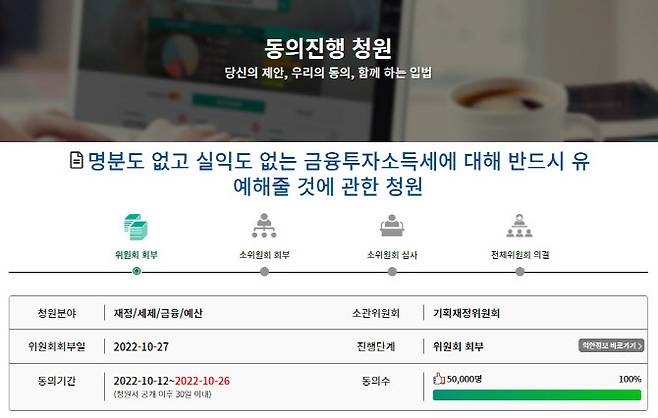 금융투자소득세(금투세) 시행 시기를 유예해 달라는 국회 국민동의청원이 5만 명의 동의를 달성했다.