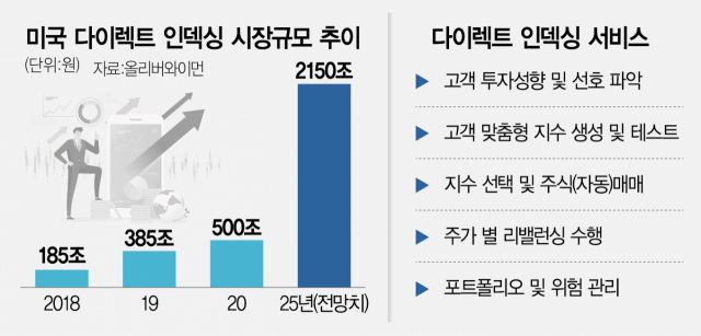 개인 맞춤형 기초 지수를 설계해주는 ‘다이렉트 인덱싱’이 국내 자산운용 업계의 새로운 먹을거리로 떠오르고 있다. 패시브 투자(지수 추종형 상품)의 확산과 직접투자의 대중화 속에서 높은 성장이 예상되고 있어서다. 업계에서는 해외에서 성공을 입증한 만큼 국내에서도 정착 가능성이 높을 것으로 기대하고 있다.