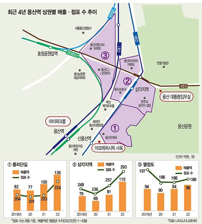‘용산’ 상권이 새로워졌다. 과거 몇몇 노포만이 드문드문 포진해 있던 용산역 골목은 최근 트렌디한 가게들이 대거 들어서며 아예 분위기 자체가 달라졌다. 근처에서 근무하는 직장인과 인근 주민들이 주로 찾던 용산역 상권은 아모레퍼시픽 신사옥과 용리단길이 급부상하면서 이제 전국에서 MZ세대가 가장 많이 방문하는 ‘힙’한 상권 중 하나로 발돋움했다. 윤석열 대통령 집권 이후에는 대통령실까지 용산으로 이전해오며 상권 활성화에 더욱 탄력을 받는 모습이다. 포스트 코로나 시대, 서울에서 가장 주목받는 상권 중 하나로 떠오른 ‘용산역’ 상권을 집중 분석해본다.