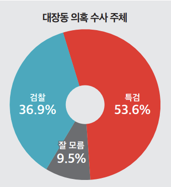 이 대표가 대선자금 의혹을 포함한 대장동 관련 의혹은 특검을 통해 규명하자는 주장을 펼쳤는데, 여론은 이에 호응하는 목소리가 우세했다. 이 대표의 대선자금을 포함해 대장동 범죄 의혹 전반에 대한 수사 주체에 관한 질문에 응답자의 53.6%는 특검을 통해 규명해야 한다는 의사를 밝혔다. 검찰을 통해 수사해야 한다는 여론은 36.9%, 잘 모름은 9.5%였다.