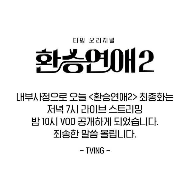 28일 오후 3시 55분 공개될 예정이었던 티빙 오리지널 예능프로그램 '환승연애2'의 공개가 돌연 오후 7시로 연기되며 시청자들의 불만이 이어지고 있다. 티빙 측은 이날 오후 공식 인스타그램 계정을 통해 공지를 올리며 "내부사정으로 오늘(28일) '환승연애2' 최종화는 저녁 7시 라이브 스트리밍/ 밤 10시 VOD 공개하게 되었습니다. 죄송한 말씀 올립니다"라고 통보했다.