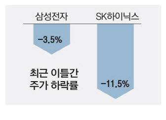 28일 한국거래소에 따르면 SK하이닉스는 이날 7.33% 하락한 8만3400원에 거래를 마쳤다. 전날에도 4.15% 하락해 이틀 만에 11% 넘게 빠졌다. 시가총액이 이틀 새 68조3000억원에서 60조8000억원으로 7조5000억원 줄어들면서 삼성바이오로직스(시총 62조2000억원)에 시총 3위 자리를 내줬다. 삼성전자도 이날 3.7% 하락해 5만7300원까지 떨어졌다. 세계 3위 D램 생산업체인 마이크론 주가도 전날 급락세를 보였다. 시장에서는 반도체 수요 둔화가 예상보다 심각해질 것이라는 분석에 힘이 실리고 있다.
