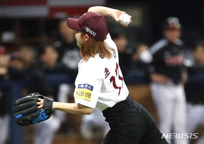 [서울=뉴시스] 정병혁 기자 = 28일 오후 서울 구로구 고척스카이돔에서 열린 2022 KBO 포스트시즌 플레이오프 4차전 LG 트윈스외 키움 히어로즈의 경기에 앞서 그룹 AOA 출신 초아가 시구를 하고 있다. 2022.10.28. jhope@newsis.com