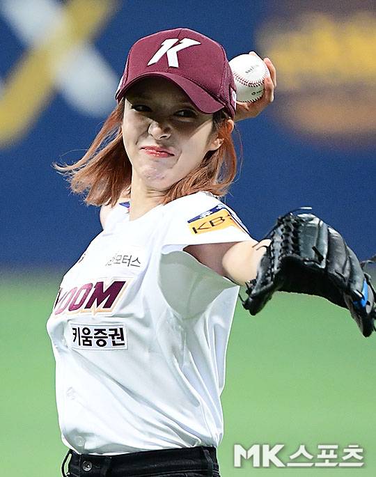경기에 앞서 그룹 AOA 출신 가수 초아가 시구를 하고 있다.