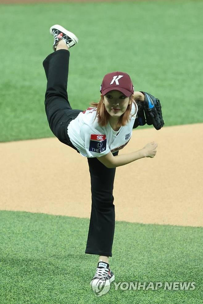 (서울=연합뉴스) 김주성 기자 = 28일 서울 고척스카이돔에서 열린 2022 프로야구 플레이오프 4차전 LG 트윈스와 키움 히어로즈의 경기에서 걸그룹 'AOA' 출신 가수 초아가 시구하고 있다. 2022.10.28