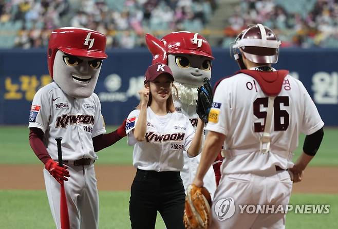(서울=연합뉴스) 임화영 기자 = 28일 서울 고척스카이돔에서 열린 2022 프로야구 플레이오프 4차전 LG 트윈스와 키움 히어로즈의 경기에 앞서 걸그룹 'AOA' 출신 가수 초아가 시구를 한 뒤 키움 포수 이지영에게 파이팅을 외치고 있다. 2022.10.28