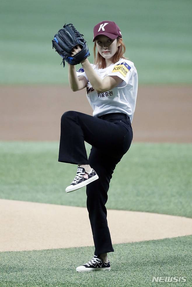 [서울=뉴시스] 최동준 기자 = 28일 서울 구로구 고척스카이돔에서 열린 2022 KBO 포스트시즌 플레이오프 4차전 LG 트윈스 대 키움 히어로즈의 경기, AOA 출신의 가수 초아가 시구를 하고 있다. 2022.10.28. photocdj@newsis.com