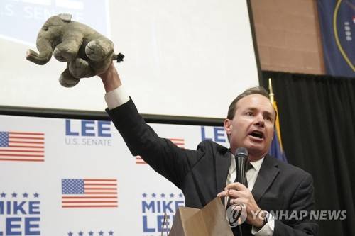 Utah Republican Sen. Mike Lee gives former Democratic Rep. Tulsi Gabbard, D-Hawaii, a stuffed elephant as she campaigns for him during a rally Thursday, Oct. 27, 2022, in Draper, Utah. Lee is locked in a competitive race against independent Evan McMullin, who throughout the campaign has spotlighted his relationship with former President Donald Trump and communications with his staff in the lead-up to the Jan. 6 attack on the U.S. Capitol. (AP Photo/Rick Bowmer)