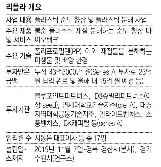플라스틱 생분해 기술 개발 ‘리플라’… 재질별 분해능력 다른 미생물 이용 특정 종류 플라스틱만 남기는 기술… 순도 1.65%만 높여도 값 1.5배로 서대표, 고교때 이미 창업 아이디어… 미생물 대량증식 환경 등에 노하우 분해 속도 점차 높여 내년엔 상업화… “플라스틱 재생 세계적 기업 되겠다”